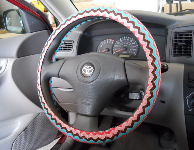I also wanted a cute new steering wheel cover because I am borrowing my parent’s car while they are living out of the country and I wanted to add some of my own flair to the car.  (I don’t think they would appreciate me slapping some bumper stickers on it, even though that would jazz things up.)  Plus the one already in the car is that pleather material that burns your hands if it’s hot, which it often is.